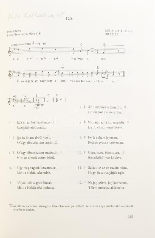 Moldvai gyűjtés. Gyűjtötte és lejegyezte: Veress Sándor. Szerk.: Berlász Melinda-Szalay Olga. Magyar Népköltési Gyűjtemény XVI. kötet. Kiadja Magyar Néprajzi Társaság. Bp.,1989, Múzsák Kiadó. Fekete-fehér fotókkal illusztrálva. Kiadói papÃrkötés. ceruzás aláhúzások, egy lap kijár