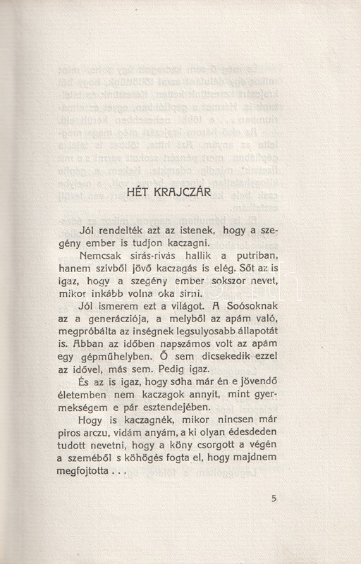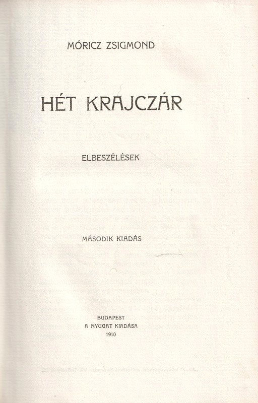 Móricz Zsigmond prózaírói berobbanása a Nyugatban megjelenő elbeszéléséhez: a Hét krajcárhoz kötődik. A lap első, 1908-as évfolyamában megjelenő elbeszélés 1909-ben kötet formájában is napvilágot látott, példányunk a mindössze egy évvel későbbi második kiadásból való.