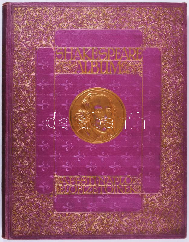 Shakespeare album. Shakespeare élete és költészete, írók tanulmányaiban, képzőművészek festményeiben, rajzaiban, rézmetszeteiben és előadóművészek alakításaiban megvilágítva. A Pesti Napló előfizetőinek készült kiadás. (Bp., 1910), Hornyánszky-ny., 1 (címkép) t.+ 132 p.+ 12 (színes, feliratozott hártyapapírral) t. Kiadói aranyozott, dombornyomott Shakespeare-portréval díszített egészvászon-kötés, kopott borítóval.