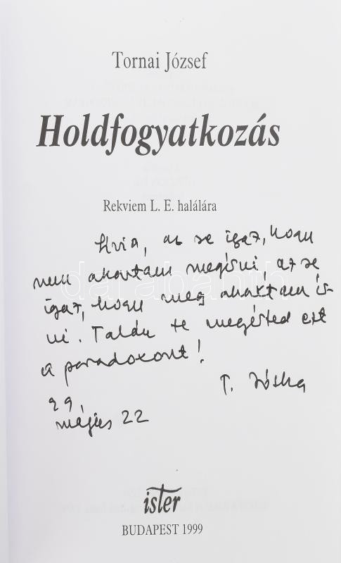 Tornai József: Holdfogyatkozás. Rekviem L. E. halálára. A szerző, Tornai József (1927-2020) Kossuth- és József Attila-díjas költő, író, műfordító által Mohás Lívia (1928-2024) pszichológus, József Attila-díjas írónak DEDIKÁLT példány. Bp., 1999., Ister. Kiadói papírkötés.