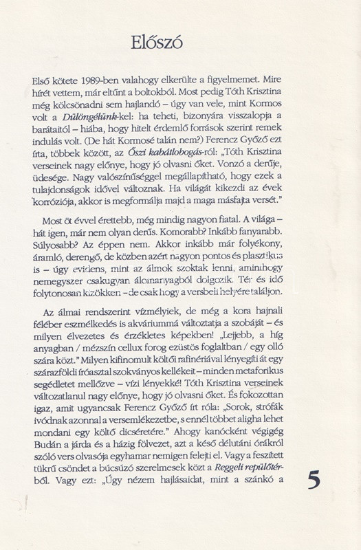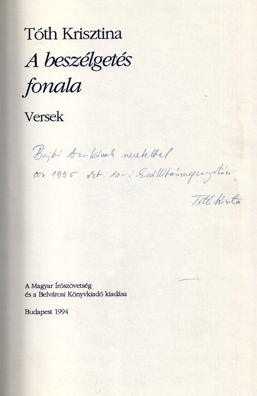 Tóth Krisztina (sz. 1967) második kötete. A dedikálásra feltehetően a budapesti Francia Intézet egy kiállításmegnyitóján került sor; a fiatal költőnő 1994 és 1998 között az intézet képzőművészeti kiállításait szervezte. Kötetünk előszavát Várady Szabolcs írta.