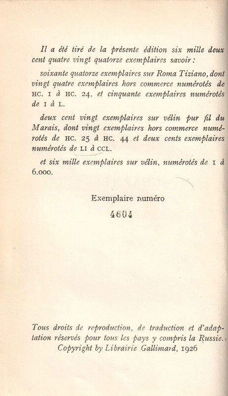 Jelentőségére való tekintettel bibliofil, számozott változatban elkészült kötetünk kolofonja: "Il a été tiré de la présente édition six mille deux cent quatre vingt quatorze exemplaires savoir: soixante quatorze exemplaires seu Roma Tiziano, dont vingt quatre exemplaires hors commerce numérotés de HC. 1 á HC. 24. et cinquante exemplaires numérotés de I a L. Deux cent vingt exemplaires sur vélin pur fil du Marais, dont vingt exemplaires hors commerce numérotes de HC. 25 á HC. 44 et deux cents exemplaires numérotés de LI á CCL. Et six mille exemplaires sur vélin, numérotés de 1 á 6000. Exemplaire numéro 4604".