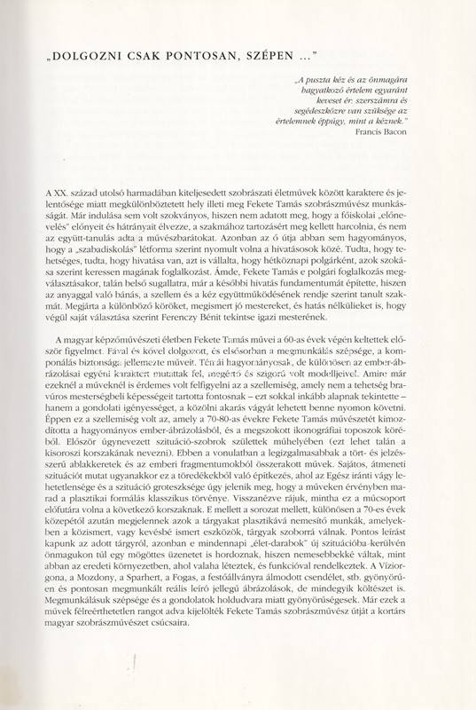Fekete Tamás (1931-2007) autodidakta szobrászművész. Műszaki főiskolai tanulmányai mellett művészeti szabadiskolákban festészetet, Ferenczy Béni műhelyében szobrászatot tanult. Figuratív köztéri szobrai, domborművei számos magyar városban megtalálhatóak. Az eleinte kisplasztikával foglalkozó művész 1964-tól szerepelt hazai csoportos és egyéni tárlatokon. Élete végén a reneszánsz Brunelleschi iránti hódolat jegyében finom művű szobor-szerszámokat alkotott. Magyar-angol nyelvű, gazdagon illusztrált képzőművészeti albumunk a mester 2002. évi életmű-kiállítása alkalmából jelent meg, a kötetet Ocsovai Dóra szerkesztette, Borsos Mihály fotózta, előszavát Bereczky Loránd művészettörténész, a Magyar Nemzeti Galéria főigazgatója írta.