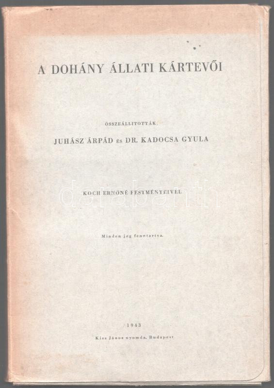 A dohány állati kártevői. Összeáll.: Juhász Árpád, Kadocsa Gyula. Koch Ernőné festményeivel. Bp., 1943, Kiss János-ny., [4]+8+[8] p.+ 21 melléklet. (Komplett.) Egyetlen kiadás. Kiadói papírmappában, a mappa egyik füle különvált. (Ritka!)