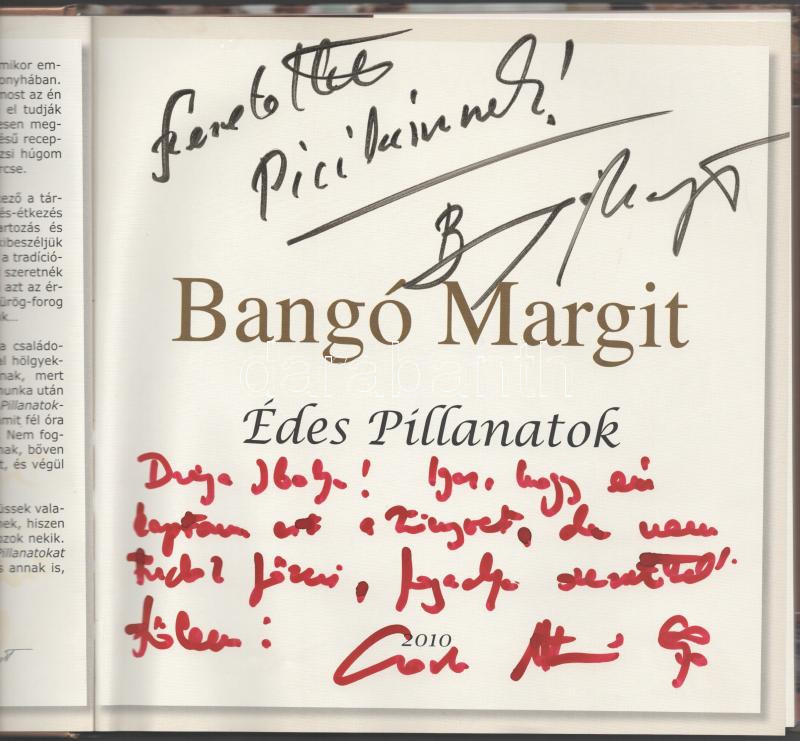 Bangó Margit: Édes pillanatok. Az író, Bangó Margit (1950-) előadóművész által Csonka András "Pici" (1965-) színművész, műsorvezető, énekes részére DEDIKÁLT példány! és Csonka András ajándékozási bejegyzésével. Bp., 2010, EMI. Gazdag képanyaggal illusztrált. CD-melléklettel. Kiadói kartonált papírkötés.