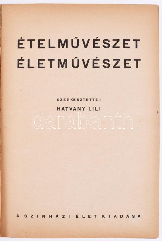 Hatvany Lili (szerk.): Ételművészet, életművészet. [Bp., 1937], Színhá... https://www.darabanth.com/hu/515-Filatelia-kepeslap-numizmatika-mutargy-konyv-papirregiseg-ekszer-aukcio/518.0/Konyvek/Konyvek-Konyha-es-kert~1043/Hatvany-Lili-szerk-Etelmuveszet-eletmuveszet-Bp-1937-Szinhazi-Elet-256plus22-p-~II3490509