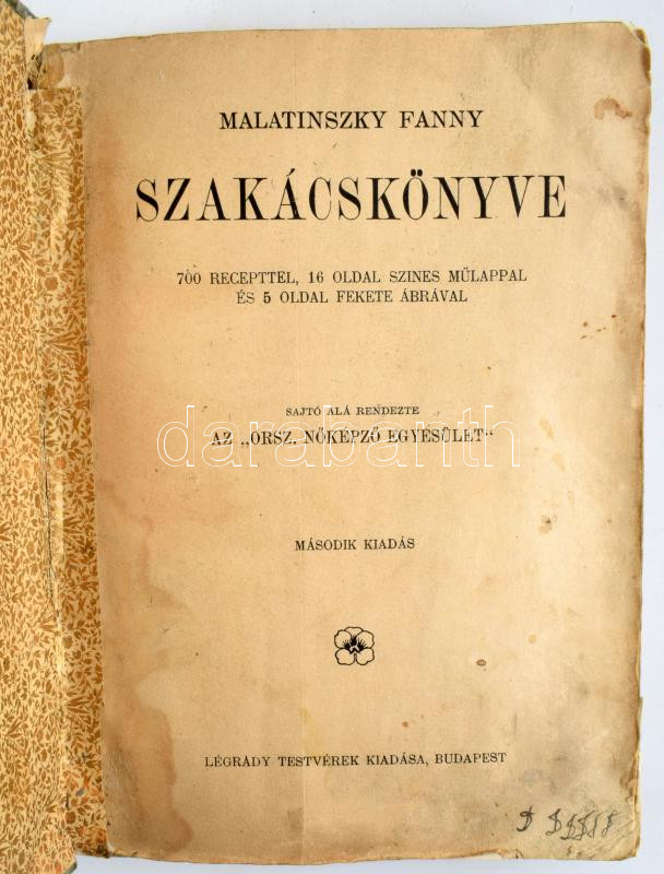 Leírás: Malatinszky Fanny szakácskönyve. Sajtó alá rendezte az "Orsz. Nőképző Egyesület". Bp., Légrády Testvérek. Félvászon kötés, előzéklap hiányzik, viseltes állapotban.