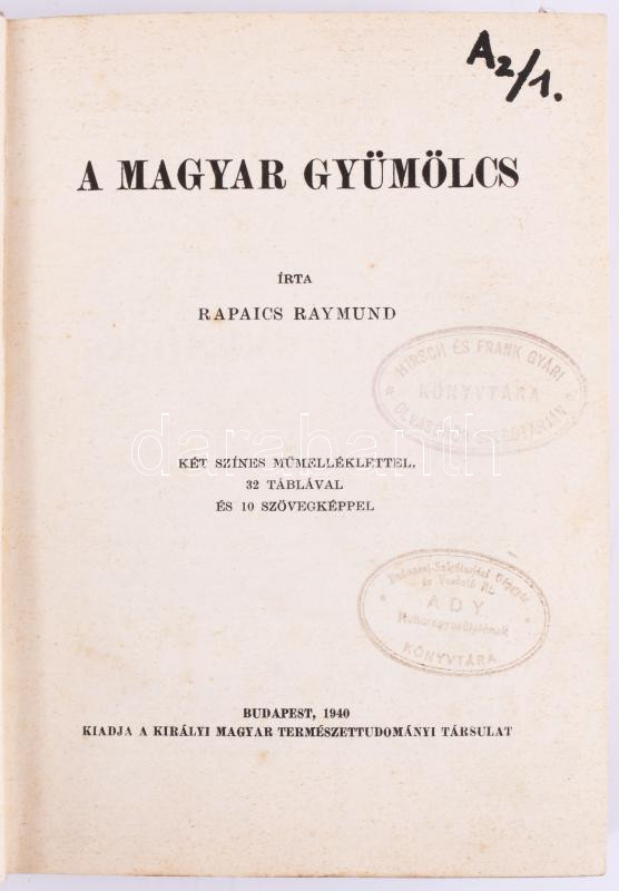 Leírás: Rapaics Raymund: A magyar gyümölcs. Bp., 1940, Kir. M. Természettudományi Társulat, [4]+350+[2] p.+ 18 t. Kiadói egészvászon-kötés, foltos borítóval, intézményi bélyegzőkkel.