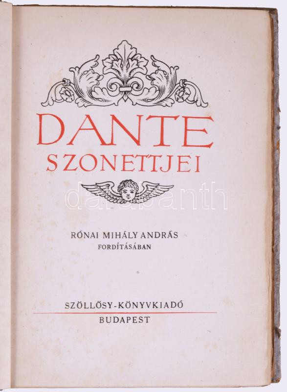Dante szonettjei. Rónai Mihály András fordításában. Bp., 1943, Szöllős... https://www.darabanth.com/hu/515-Filatelia-kepeslap-numizmatika-mutargy-konyv-papirregiseg-ekszer-aukcio/518.0/Konyvek/Konyvek-Mesekonyvek-ifjusagi-irodalom~1054/Dante-szonettjei-Ronai-Mihaly-Andras-forditasaban-Bp-1943-Szollosy-Konyvkiado-110p~II3472800