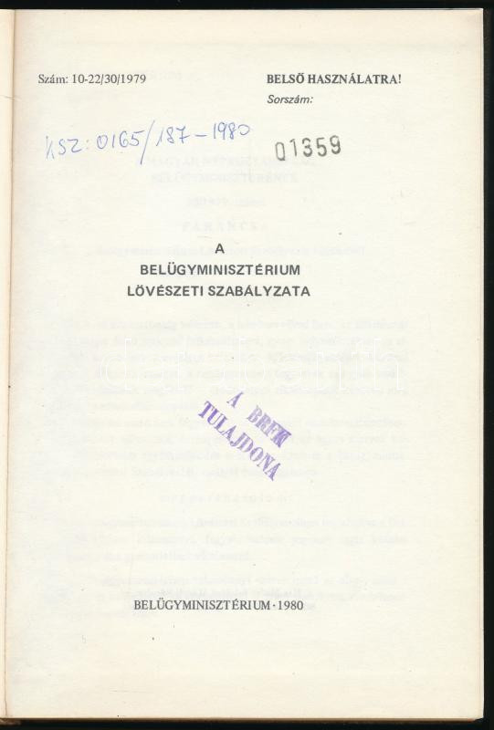 Leírás: A Belügyminisztérium lövészeti szabályzata. (Belső használatra!) Számozott, 1359. sorszámú példány. [Bp.], 1980, Belügyminisztérium, 272 p. Kiadói egészvászon-kötés, jó állapotban.