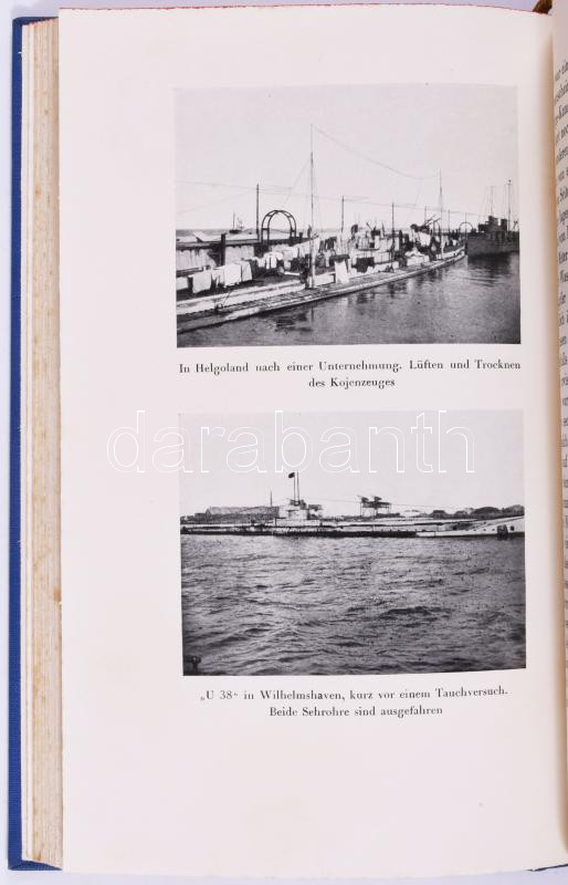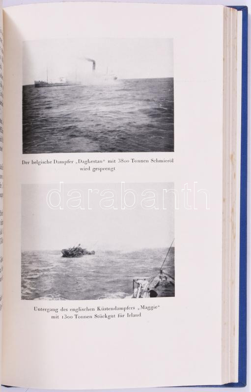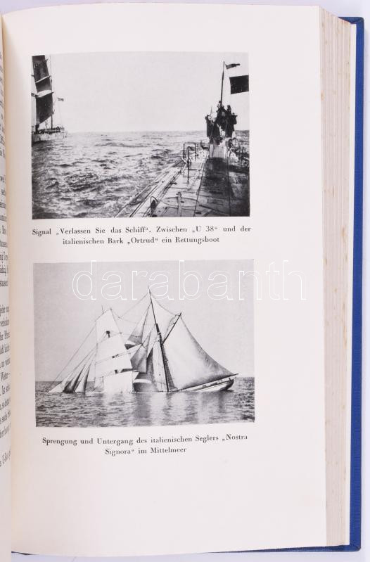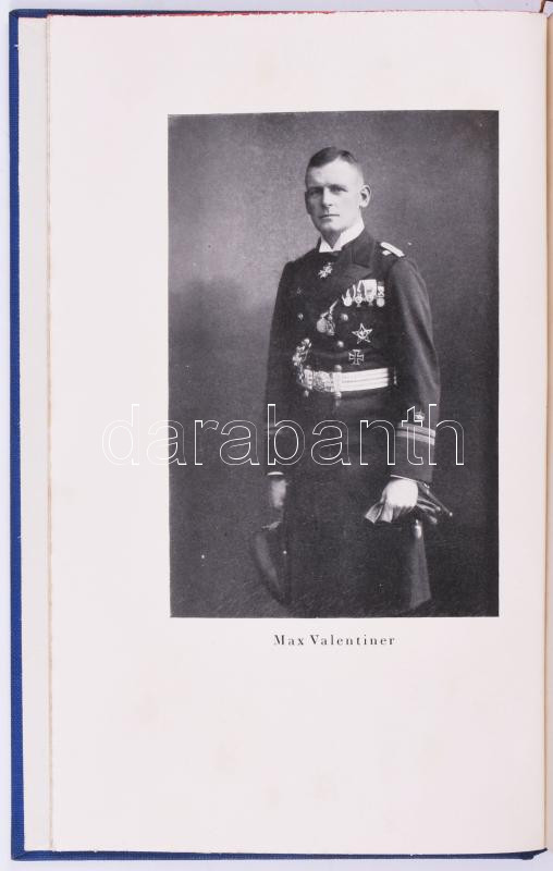 Max Valentiner: Der Schrecken der Meere. Meine U-Boot-Abenteuer. Zürich-Leipzig-Wien,1931,Amalthea-Verlag, 1 (címkép) t.+327+1 p.+7 (kétoldalas ekete-fehér képtáblák) t. Német nyelven. Horthy Miklósnak szóló nyomtatott ajánlással: "Sr. Durchlacht dem Herrn Reichsverweser von Ungarn Admiral Nikolaus Horthy de Nagybánya dem glorreichen Sieger der Otranto-Slacht in Verehrung gewindet." Christian Valentiner kapitány (18833-1949) az első világháború elismert német tengeralattjáró-parancsnok a. Az első világháború 3. legtöbb pontot elért U-boat-parancsoka, és érdemeiért "Pour le Mérit"-tel tüntették ki. Kiadói aranyozott egészvászon-kötés, festett felső lapélekkel, kissé foltos lapélekkel.