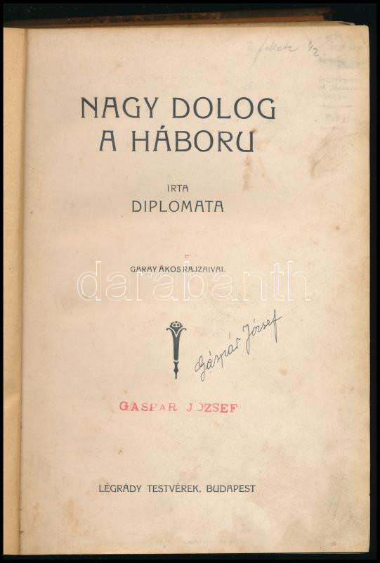 Leírás: Pellegrini Albert) Diplomata: Nagy dolog a háború. . Bp. (191?.) Légrády. 249 l. Garay Ákos rajzaival. Kiadói, kopott félvászon-kötésben néhány foltos lappal .