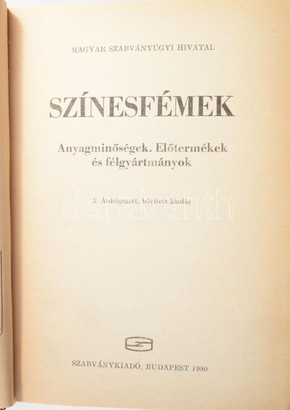 Leírás: Horváth Csabáné - Avar Árpád (szerk.): Színesfémek. Anyagminőségek. Előtermékek és félgyártmányok. MSZ szabványgyűjtemények 44. Bp., 1980, Szabványkiadó, 1080 p. Kiadói félvászon-kötés, kissé kopottas borítóval. Megjelent 4000 példányban.