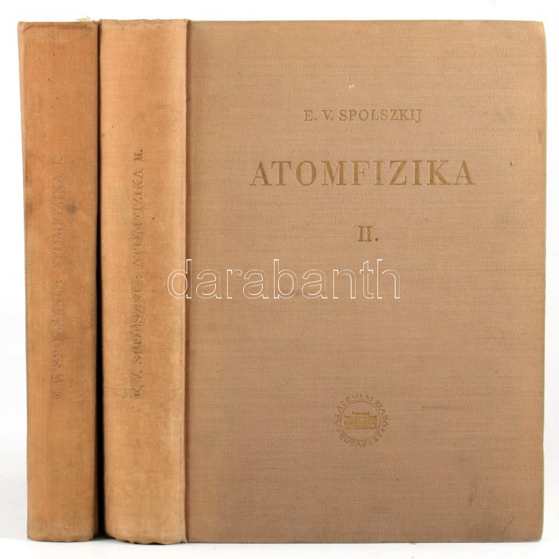 E. V. Spolszkij: Atomfizika I-II. köt. I. köt.: Bevezetés az atomfizikába. Ford.: Sándor Endre. II. köt.: Az atom elektronburka és az atommag. Bp., 1956-1958, Akadémiai Kiadó. 2. és 3. kiadás. Nagy Elemér (1920-2000) fizikus, villamosmérnök, egyetemi tanár ajándékozási soraival, dátumozva (1960. jún. 22.) Megjelentek 1050 és 1620 példányban. Kiadói egészvászon-kötések.