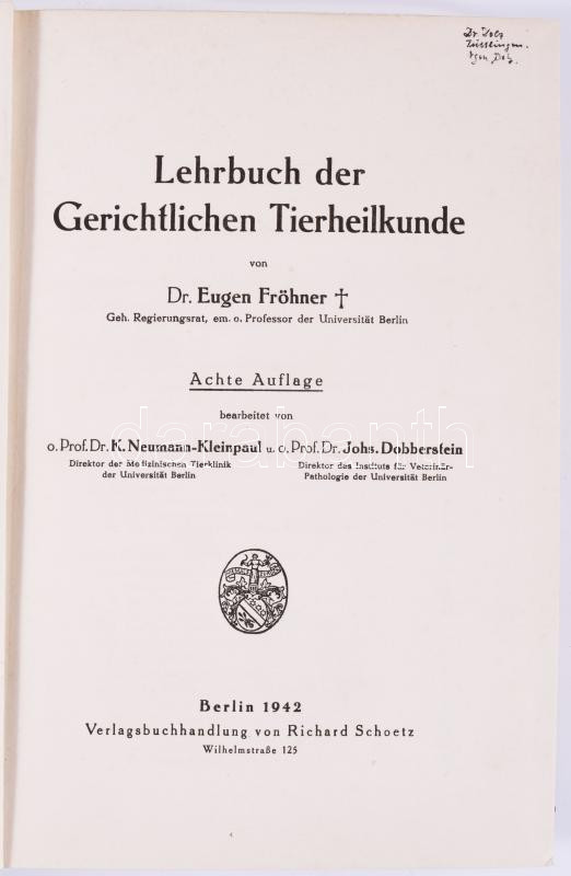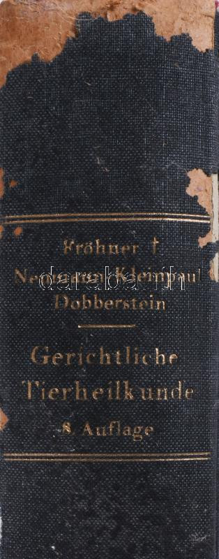 Eugen Fröhner - K. Neumann-Kleinpaul - Johs. Dobberstein: Lehrbuch der Gerichtlichen Tierheilkunde. Berlin, 1942, Richard Schoetz, XII+378 p. Német nyelven. Átkötött félvászon-kötésben, sérült gerinccel és kötéssel, aláhúzásokkal és bejelölésekkel.