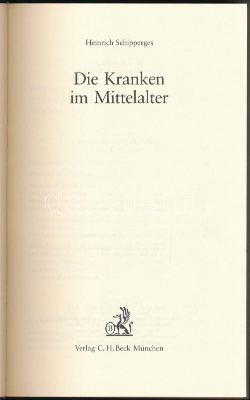 Heinrich Schipperges: Die Kranken im Mittelalter. München, 1993, C. H. Beck. Német nyelven. Kiadói kartonált papírkötés, kiadói papír védőborítóban.
