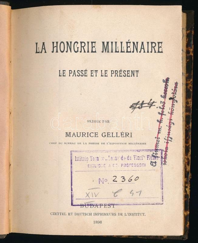 [Gelléri Mór] Gelléri, Maurice: La Hongrie millénaire. Le passé et le présent. [ Az ezeréves Magyarország multjából és jelenéből.] Bp., 1896, Czettel et Detusch, 161+3 p. + 6 (litográfia) t. Francia nyelven. Átkötött félvászon-kötés, kissé kopott borítóval, a gerincen és a borítón címkével.