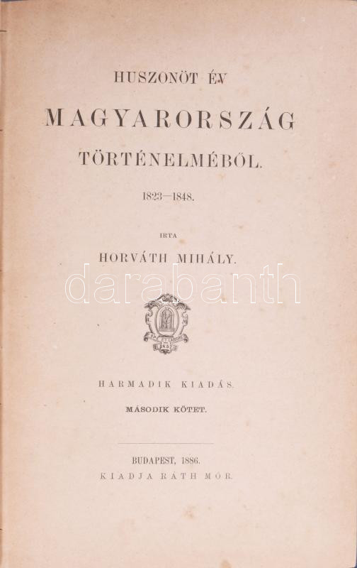 Horváth Mihály: Huszonöt év Magyarország történelméből 1823-1848. I-III. kötet. Horváth Mihály: Magyarország történelme IX-X. köt. Bp.,1886,Ráth Mór, XVI+461+3 p.; VII+466+2 p; VII+508 p. Harmadik kiadás. Átkötött félvászon-kötés, kopott borítóval, a gerinceken apró sérülésekkel.