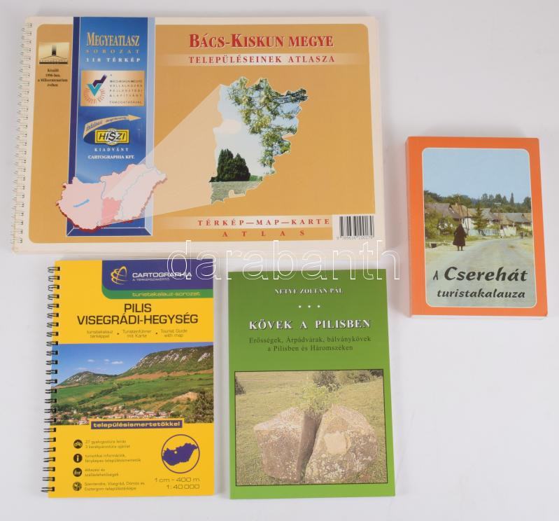 4 darab útikönyv és térkép. Kövek a Pilisben, A Cserehát turistakalauza, Pilis Visegrádi-hegység, Bács-Kiskun megye településeinek atlasza.
