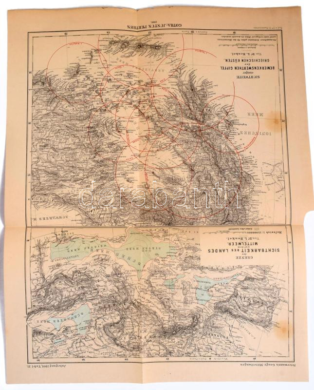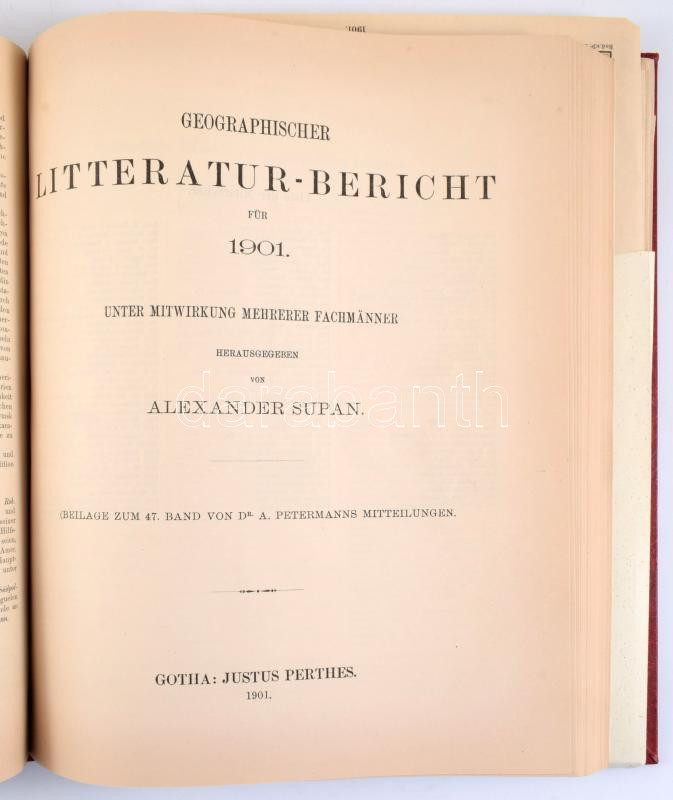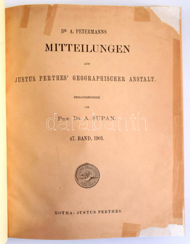 Dr. A. Petermanns [Geographische] Mitteilungen aus Justus Perthes' Geographischer Anstalt. 47. Band, 1901. Hrsg. von Prof. Dr. A. Supan. Hozzákötve: Geographischer Litteratur Bericht für 1901. Unter Mitwirkung Mehrerer Fachmänner. Hrsg. Alexander Supan. (Beilage zum 47. Band von Dr. A. Petermanns Mitteilungen.) Gotha, 1901., Justus Perthes, VI+290;+XI+1+208 p.+21 (térkép-mellékletek, kötet végén egy tokban) t. Német nyelven. Átkötött modern műbőr-kötésben, régi bélyegzésekkel, két tábla szélén kis sérülésekkel, az első 2 lap restaurált, jó állapotban.