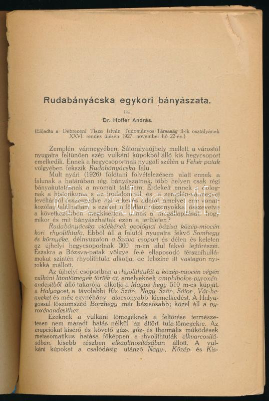 Hoffer András: Rudabányácska egykori bányászata. Debreceni Tisza István Tudományos Társaság II. (Orvos-Természettudományi) Osztályának munkái III. köt. 1. füzet. Debrecen, 1928., Tisza István-Tudományegyetem, 60 p. Kiadói papírkötés, sérült, javított, részben pótolt borítóval, szakadt címlappal.