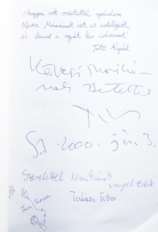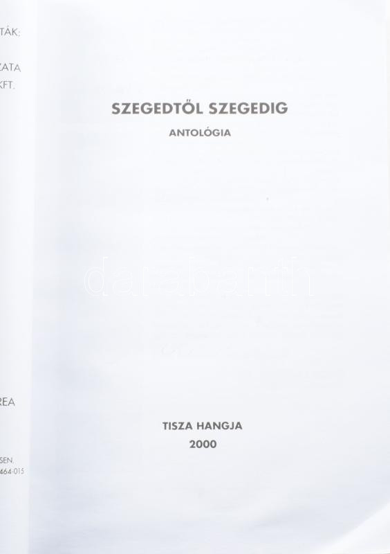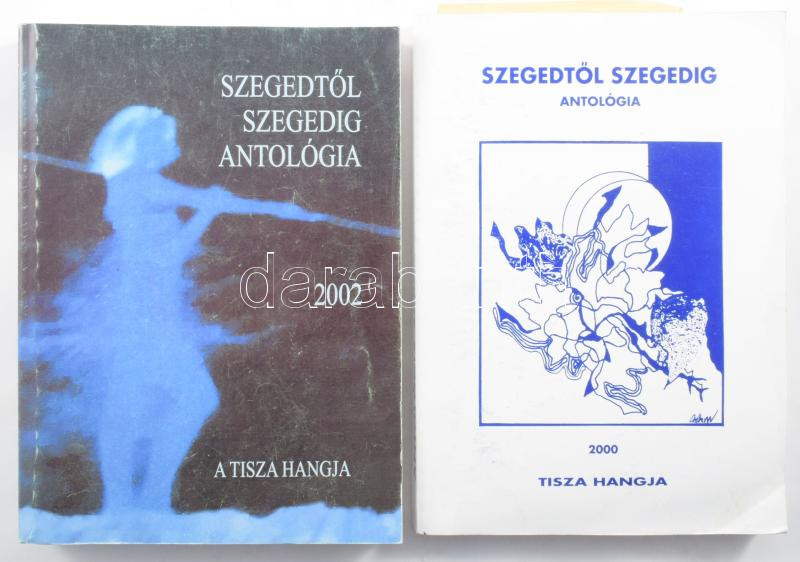 Szegedtől Szegedig Antológia. Tisza hangja. 2000+2002. Főszerk.: Simai Mihály. A 2000-es antológia, Tritz Árpád, Vangel Edit, Turi Tímea és Takács Tibor, és egy azonosítatlan személy által DEDIKÁLT példány! Szeged, 2000-2002, Bába és Társai Kft - Szegedi Írók Társasága. Kiadói papírkötések, az egyik hátsó borítója foltos, a másik kissé kopott.