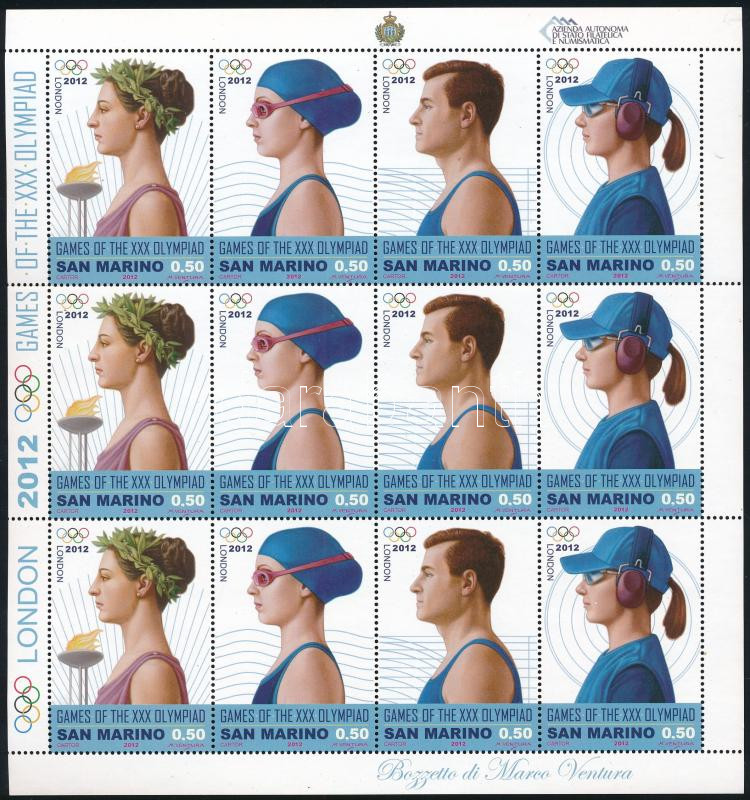 2012 Londoni olimpia ív Mi 2525-2528 https://www.darabanth.com/hu/515-Filatelia-kepeslap-numizmatika-mutargy-konyv-papirregiseg-ekszer-aukcio/518.0/Kulfoldi-filatelia-es-postatortenet/San-Marino~498/2012-Londoni-olimpia-iv-Mi-2525-2528~II3488579