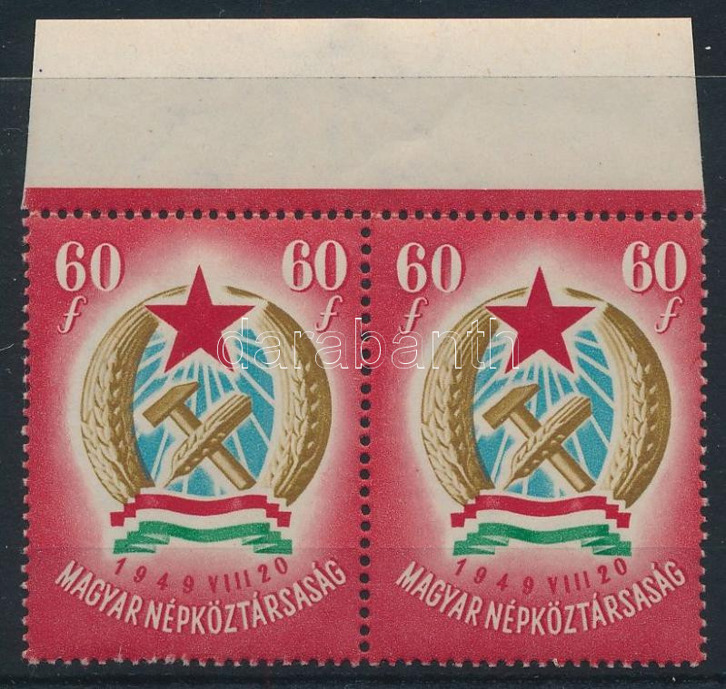 1949 Alkotmány 60f ívszéli pár mindkét bélyegen makkos vízjellel (14.0... https://www.darabanth.com/hu/515-Filatelia-kepeslap-numizmatika-mutargy-konyv-papirregiseg-ekszer-aukcio/518.0/Magyar-filatelia-es-postatortenet/1946-1956-kozotti-kiadasok~117/1949-Alkotmany-60f-ivszeli-par-mindket-belyegen-makkos-vizjellel-14000~II3488348