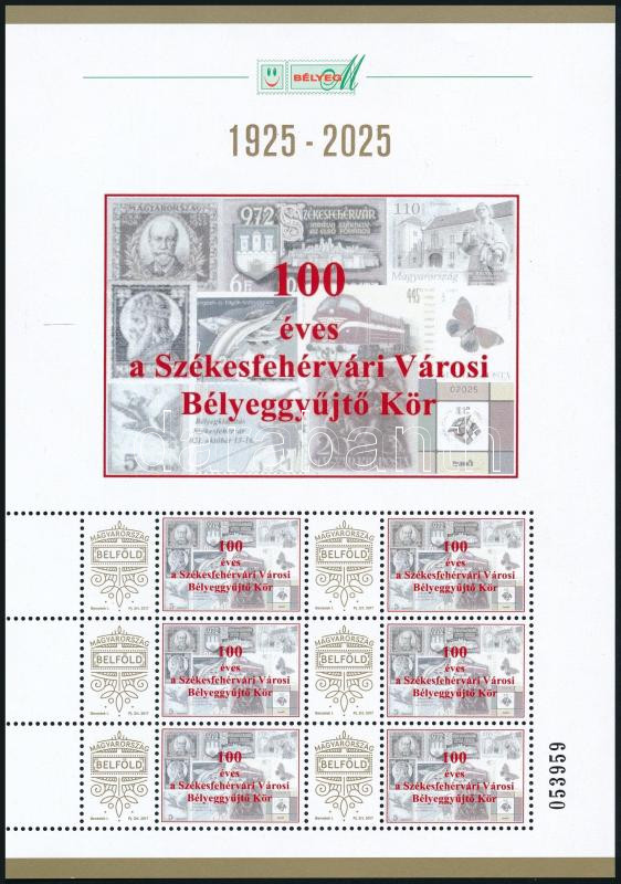 Leírás: 2025 100 éves a Székesfehérvári Városi Bélyeggyűjtő kör 6 db bélyeget tartalmazó megszemélyesített kisív