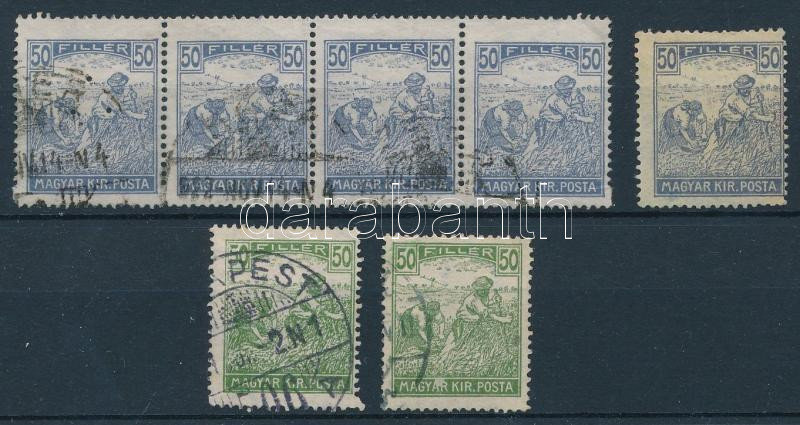 Leírás: 1920/24 Arató 50f ibolyakék négyescsík magasabbra fogazva + támpéldány, és Arató 50f elfogazva + támpéldány
