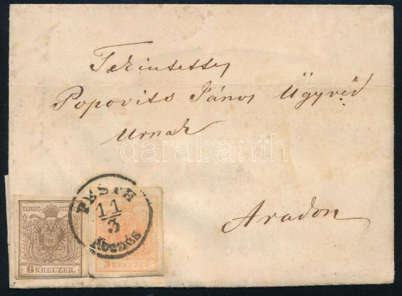 Leírás: ~1855 3kr MP III + 6kr MP III levélen "PESTH Abends" - "ARAD"