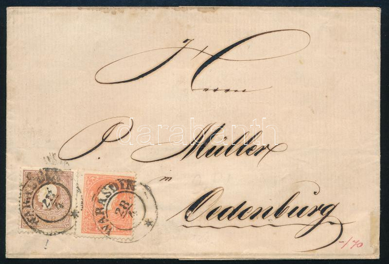 Leírás: 1860 10kr II. kis festékfolttal + 5kr II. levélen "WARASDIN" - Oedenburg