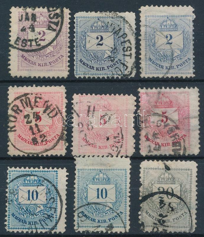 Leírás: 1881 9 db I. típusú krajcáros bélyeg 11 1/2 fogazással, az átlagtól eltérő formájúak: széles, magas, alacsony, keskeny