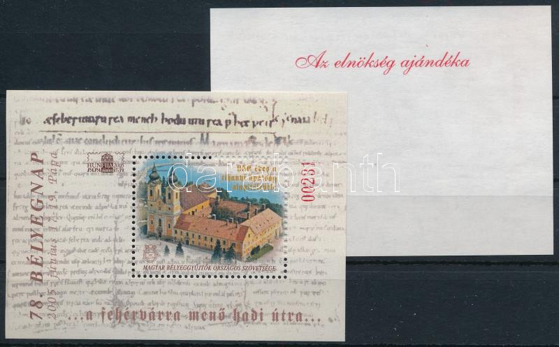 Leírás: 2005 78. Bélyegnap ajándék fogazott-vágott emlékív pár azonos sorszámmal hátoldalán "AZ ELNÖKSÉG AJÁNDÉKA" felirattal