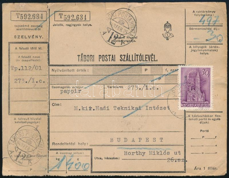 1943 Tábori posta szállítólevél 1,4 kg-os csomagról, kedvezményes 30f ... https://www.darabanth.com/hu/515-Filatelia-kepeslap-numizmatika-mutargy-konyv-papirregiseg-ekszer-aukcio/518.0/Magyar-filatelia-es-postatortenet/II-Vilaghaborus-tabori-posta~114/1943-Tabori-posta-szallitolevel-1-4-kg-os-csomagrol-kedvezmenyes-30f-dijjal-TABORI-POSTA~II3487836