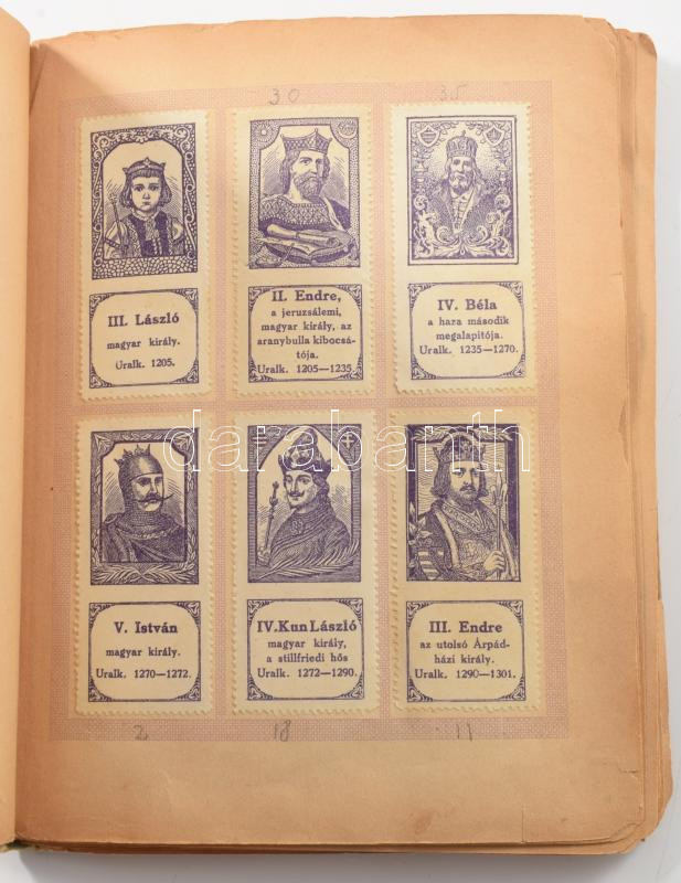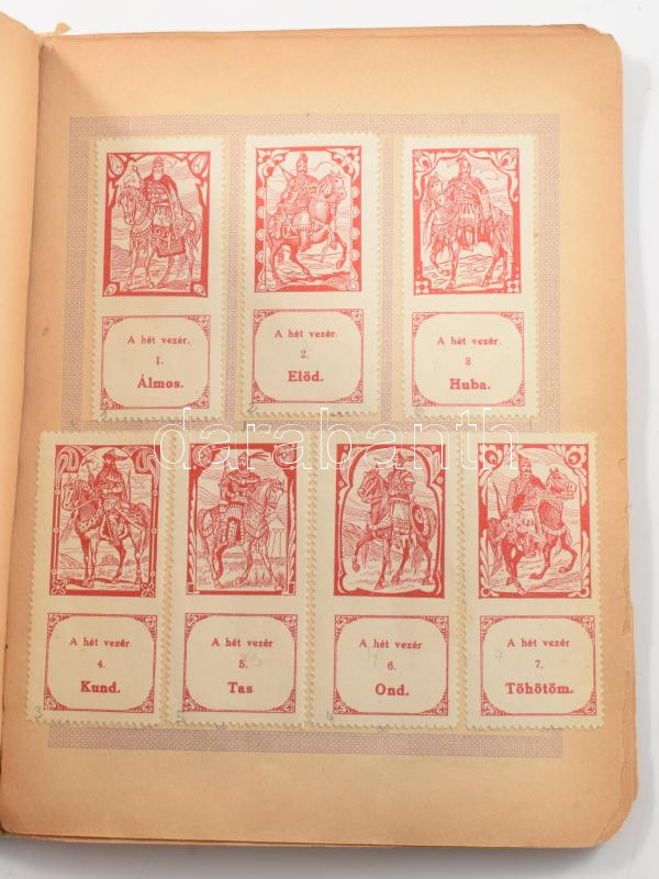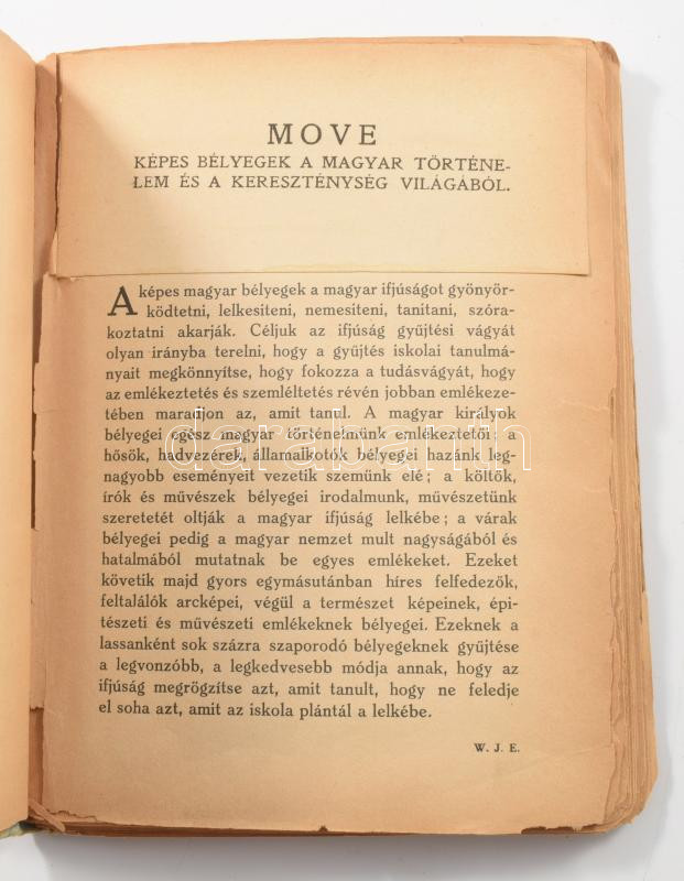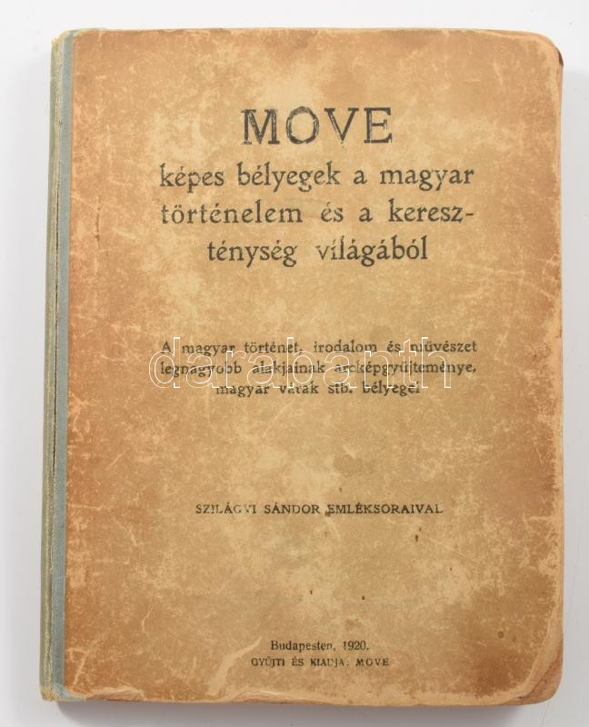 1920 A MOVE (Magyar Országos Véderő Egyesület) képes bélyegek albuma a magyar történelem és a kereszténység világából (történelem, irodalom, művészet nagyjai, aradi vértanúk, várak stb.), összesen 154 db 3×6 cm-es beragasztott bélyeggel, a lapok megbarnultak, a bélyegek szép állapotúak, ritka!