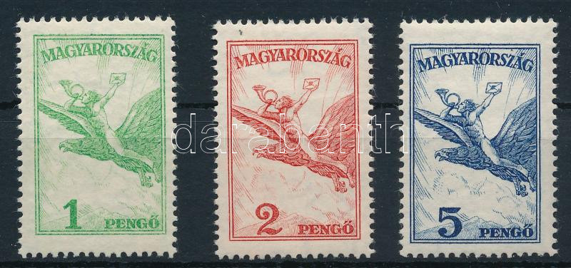 1927 Repülő (I.) 1P, 2P, 5P (** 11.100) https://www.darabanth.com/hu/515-Filatelia-kepeslap-numizmatika-mutargy-konyv-papirregiseg-ekszer-aukcio/518.0/Magyar-filatelia-es-postatortenet/Pengo-idoszak-1926-1944~113/1927-Repulo-I-1P-2P-5P-11100~II3484911
