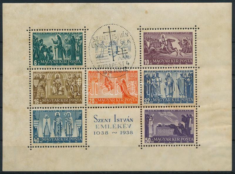 1938 Szent István blokk (rozsda) https://www.darabanth.com/hu/515-Filatelia-kepeslap-numizmatika-mutargy-konyv-papirregiseg-ekszer-aukcio/518.0/Magyar-filatelia-es-postatortenet/Pengo-idoszak-1926-1944~113/1938-Szent-Istvan-blokk-rozsda~II3487485