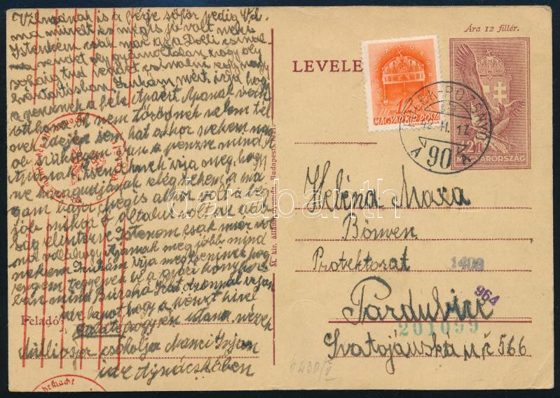 Leírás: 1942 12f díjjegyes levelezőlap azonos címletű Templom 12f díjkiegészítéssel, "FÜLEK-ROZSNYÓ / 90 A" mozgóposta bélyegzéssel, 4 jelzéssel cenzúrázva, a Cseh-Morva Protektorátusba küldve