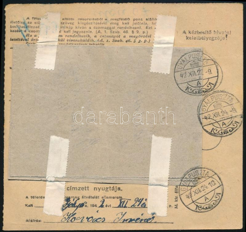 1942 Élelmiszer tartalmú 11,5 kg-os csomag szállítólevele 1P80f díjjal... https://www.darabanth.com/hu/515-Filatelia-kepeslap-numizmatika-mutargy-konyv-papirregiseg-ekszer-aukcio/518.0/Magyar-filatelia-es-postatortenet/Pengo-idoszak-1926-1944~113/1942-Elelmiszer-tartalmu-11-5-kg-os-csomag-szallitolevele-1P80f-dijjal-hozzarogzitve-a-M-~II3487823