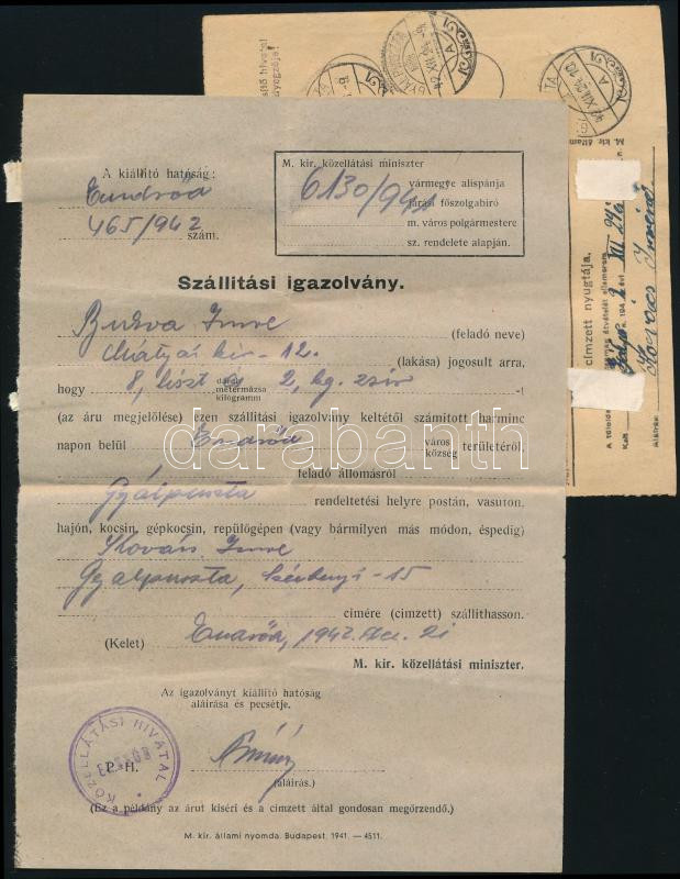 Leírás: 1942 Élelmiszer tartalmú 11,5 kg-os csomag szállítólevele 1P80f díjjal, hozzárögzítve a M. kir. közellátási miniszter szállítási igazolványa, "ENDRŐD" - "GYÁLPUSZTA". Rendkívül ritka csomagküldemény!