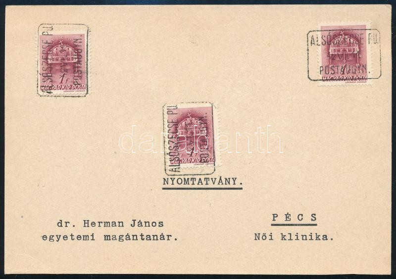 1942 Nyomtatvány "ALSÓSZECSE PU." postaügynökségi bélyegzéss... https://www.darabanth.com/hu/515-Filatelia-kepeslap-numizmatika-mutargy-konyv-papirregiseg-ekszer-aukcio/518.0/Magyar-filatelia-es-postatortenet/Pengo-idoszak-1926-1944~113/1942-Nyomtatvany-ALSOSZECSE-PU-postaugynoksegi-belyegzessel~II3490657