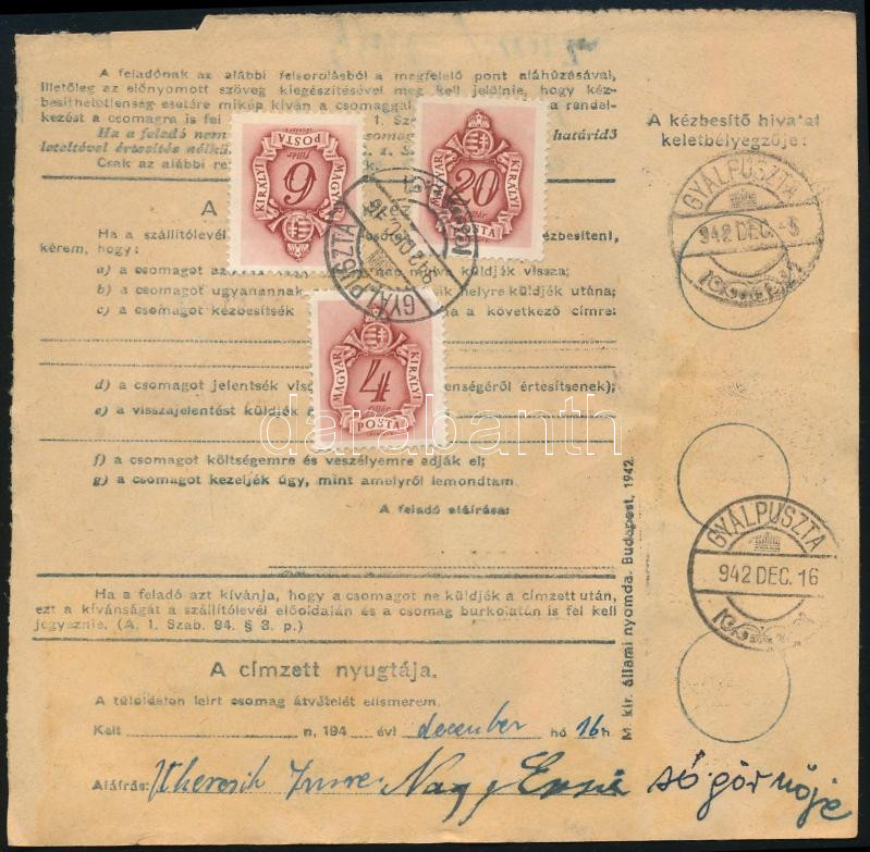 Leírás: 1942 Sült disznó tölteléket tartalmazó 10,3 kg-os csomag szállítólevele 1P50f díjjal, a hátoldalon 20+6+4f fekbérportóval, "DUNASZERDAHELY" - "GYÁLPUSZTA"
