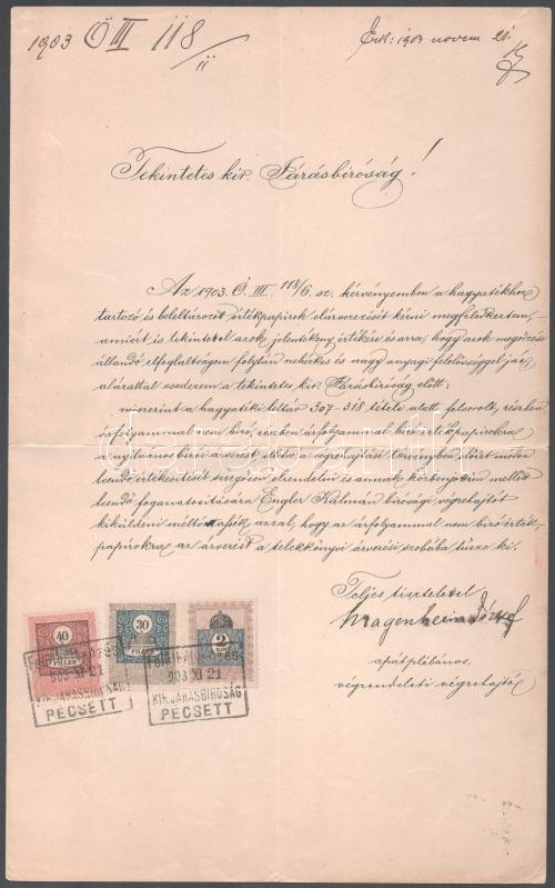 Leírás: 1903 Magenheim József (1853-1920) a pécs-belvárosi templom apátplébánosa által aláírt dokumentum.