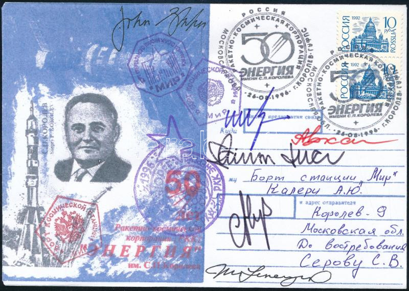 A Szojuz TM 24 ürhajó és a MIR legénysége Claudie André-Deshays (1957-) francia, Alekszandr Kaleri (1956- ), Valerij Korzun (1953- ) szovjet, Shannon Lucid (1943- ), John E. Blaha (1942- ), Jerry M. Linenger (1955- ) amerikai űrhajósok aláírásai emlékborítékon / Signatures of Aleksandr Kaleri (1956- ) Valeriy Korzun (1953- ) Soviet, Shannon Lucid (1943- ), John E. Blaha (1942- ), Jerry M. Linenger (1955- ) American and Claudie André-Deshays (1957-) French astronauts on envelope