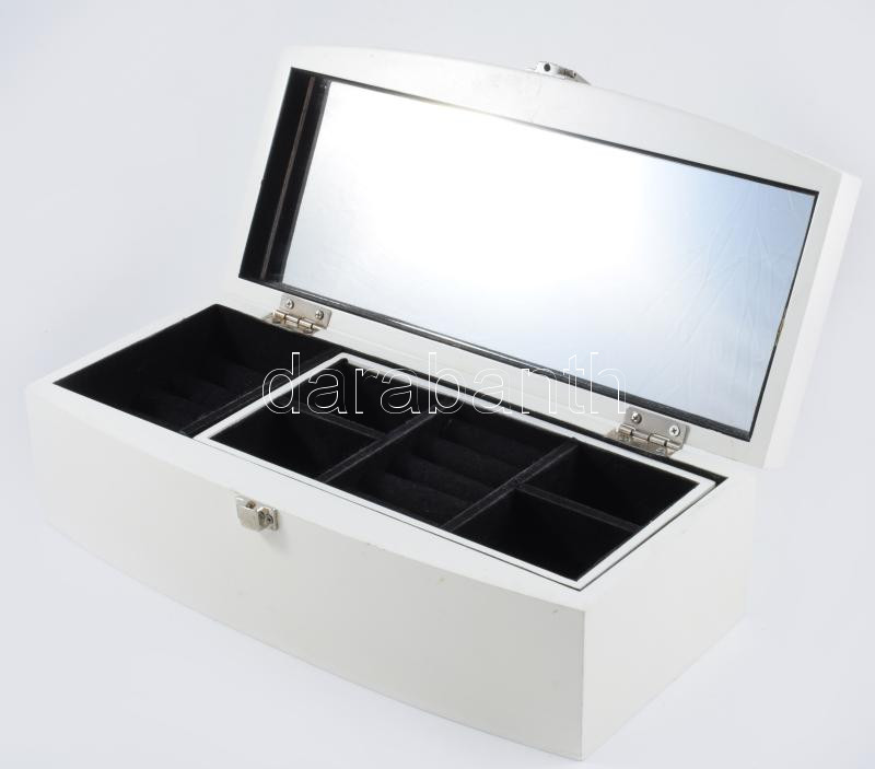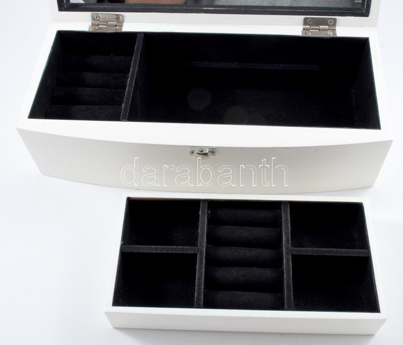Leírás: Ékszertartó doboz, fedelében tükörrel, belül kivehető fiókkal, jó állapotban, 30x14 cm