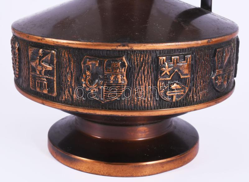 Leírás: Iparművészeti réz címeres váza. Kis kopással, m: 31 cm