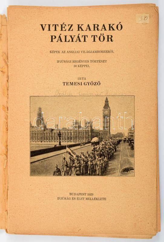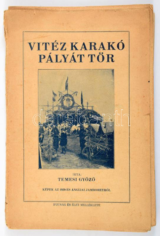Leírás: Temesi Győző: Vitéz Karakó pályát tör. Képek az angliai világjamboreeről. Ifjúság és Élet Könyvei V. köt. Bp., 1929, Ifjúság és Élet (Biró Miklós-ny.), 104 p. Szövegközi fekete-fehér képekkel illusztrálva. Kiadói papírkötés, fűztésnél szétvált