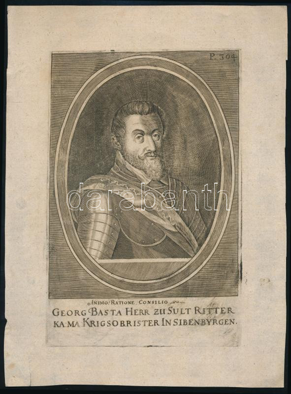 Leírás: Giorgio Basta (1550-1607) német-római császári hadvezér. Erdély kormányzója, rézmetszetű portré. Ca 1650 13x20 cm
