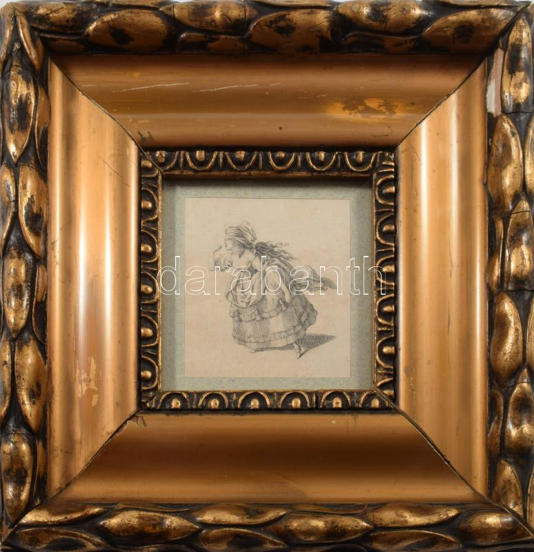 Leírás: cca 19. század Fiatal nőt ábrázoló rézmetszet, üvegezett keretben, 7,5×6,5 cm, keret: 20×20 cm